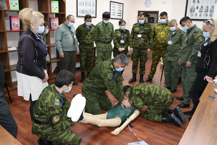 Участники во время практики оказания первой помощи и эвакуации раненых во время обезвреживания взрывоопасных предметов, Чимтеппа, Таджикистан, 30 марта 2021 года.
