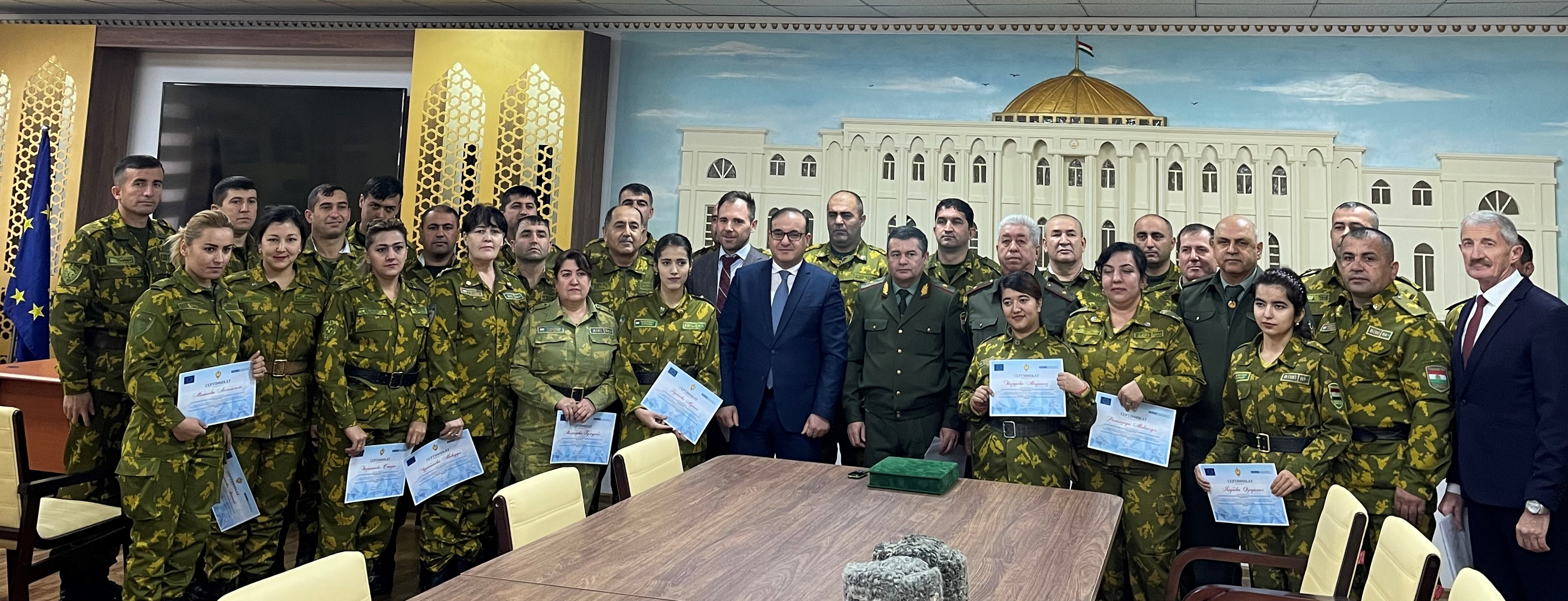 Офицеры пограничных войск Таджикистана во время церемонии закрытия четырехнедельного учебного курса по укреплению устойчивого потенциала в проведении полевых операций, Душанбе, 18 ноября 2021 года.