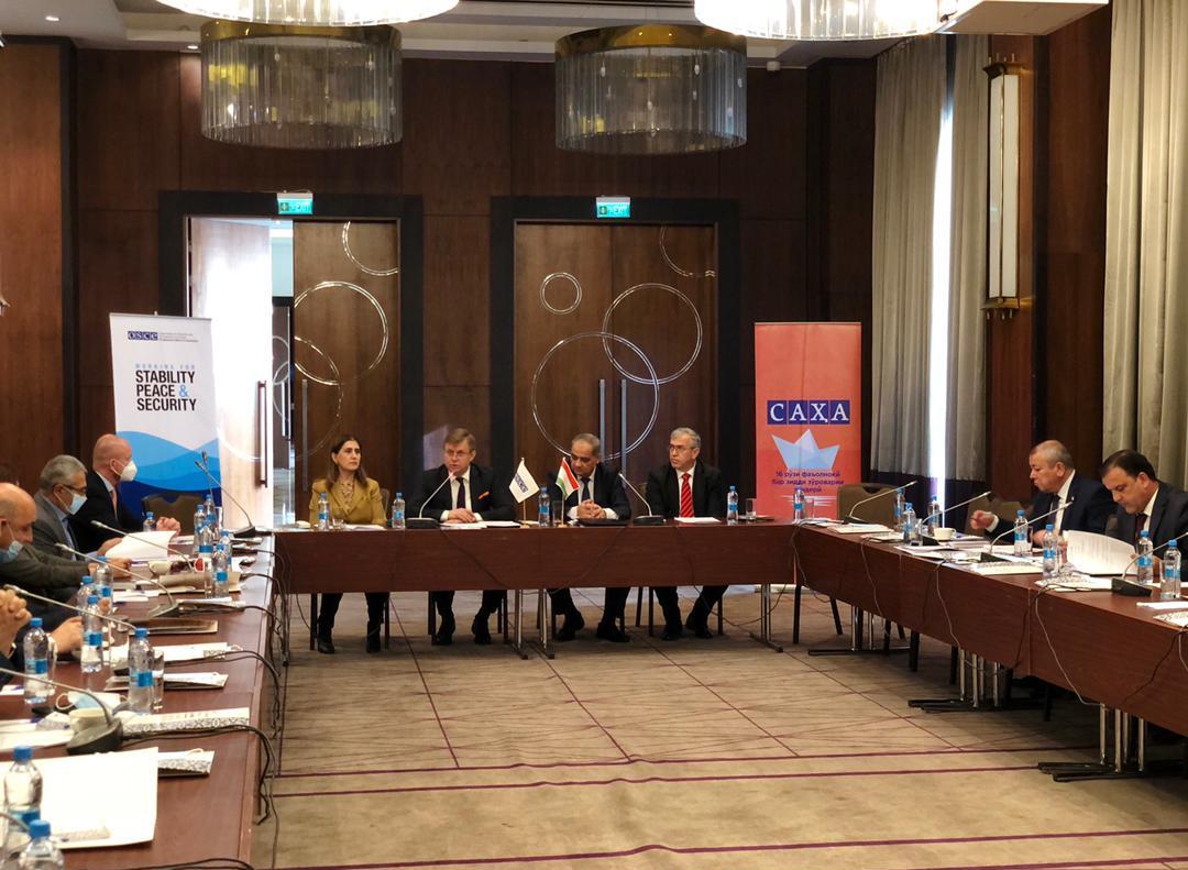 Валериу Киверь (в центре слева), руководитель программного офиса ОБСЕ в Душанбе, выступает на круглом столе по анализу стратегических документов в области СМИ в Таджикистане, Душанбе, 2 декабря 2021 года.