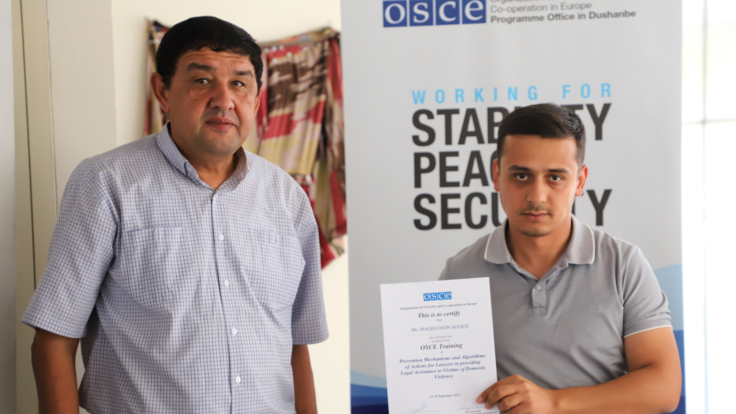 (слева направо) Бахтиёр Насруллоев, специализированный тренер и юрист из поддерживаемого ОБСЕ женского ресурсного центра «Занҳо зидди зуроварӣ», вручает сертификат о прохождении обучения Максуджону Содики, юристу из Пенджикента, Душанбе, 29 сентября 2023 г.
