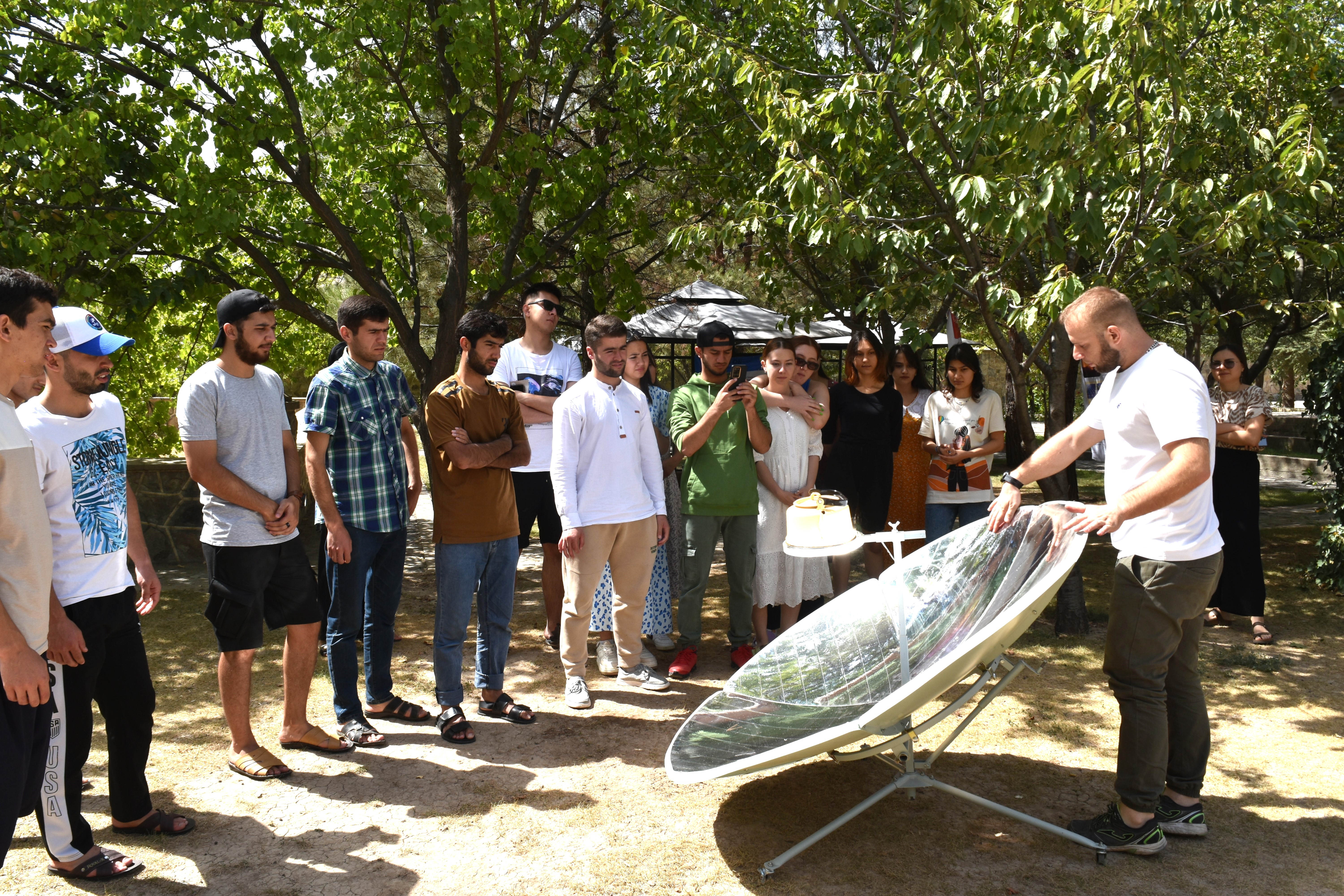 Таджикская молодежь на выставке энергоэффективных технологий и устройств, использующих солнечную энергию в рамках Молодежной экошколы, организованной ОБСЕ, Душанбе, 21 августа 2023 года.