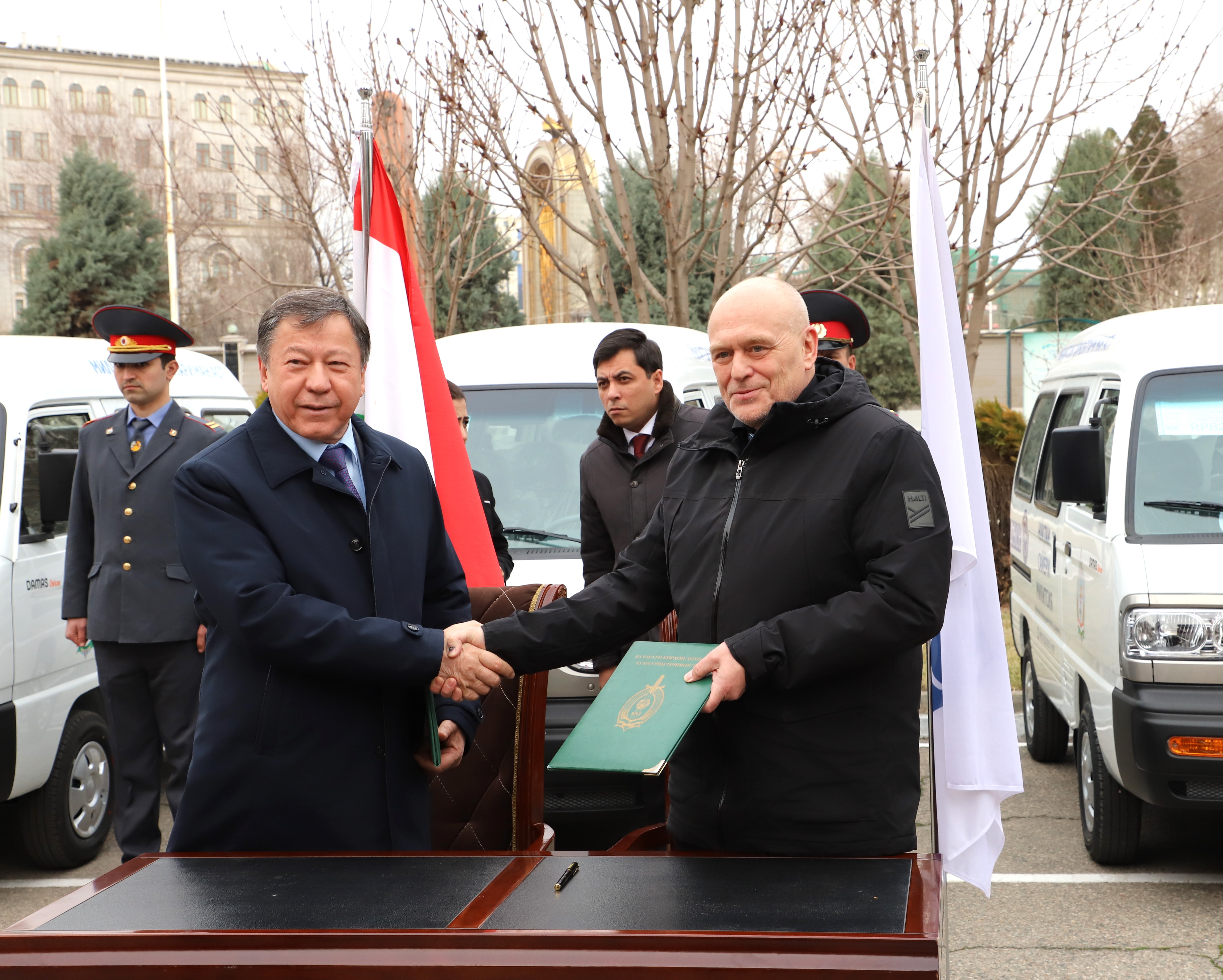 (слева направо) генерал-полковник Рахимзода Рамазон, Министр внутренних дел Республики Таджикистан, и Юкка Туононен, Исполняющий обязанности Главы Программного офиса ОБСЕ в Душанбе, на церемонии передачи в дар микроавтобусов, оборудованных для работы в качестве мобильных приемных милиции, Душанбе, 7 февраля 2024 года.