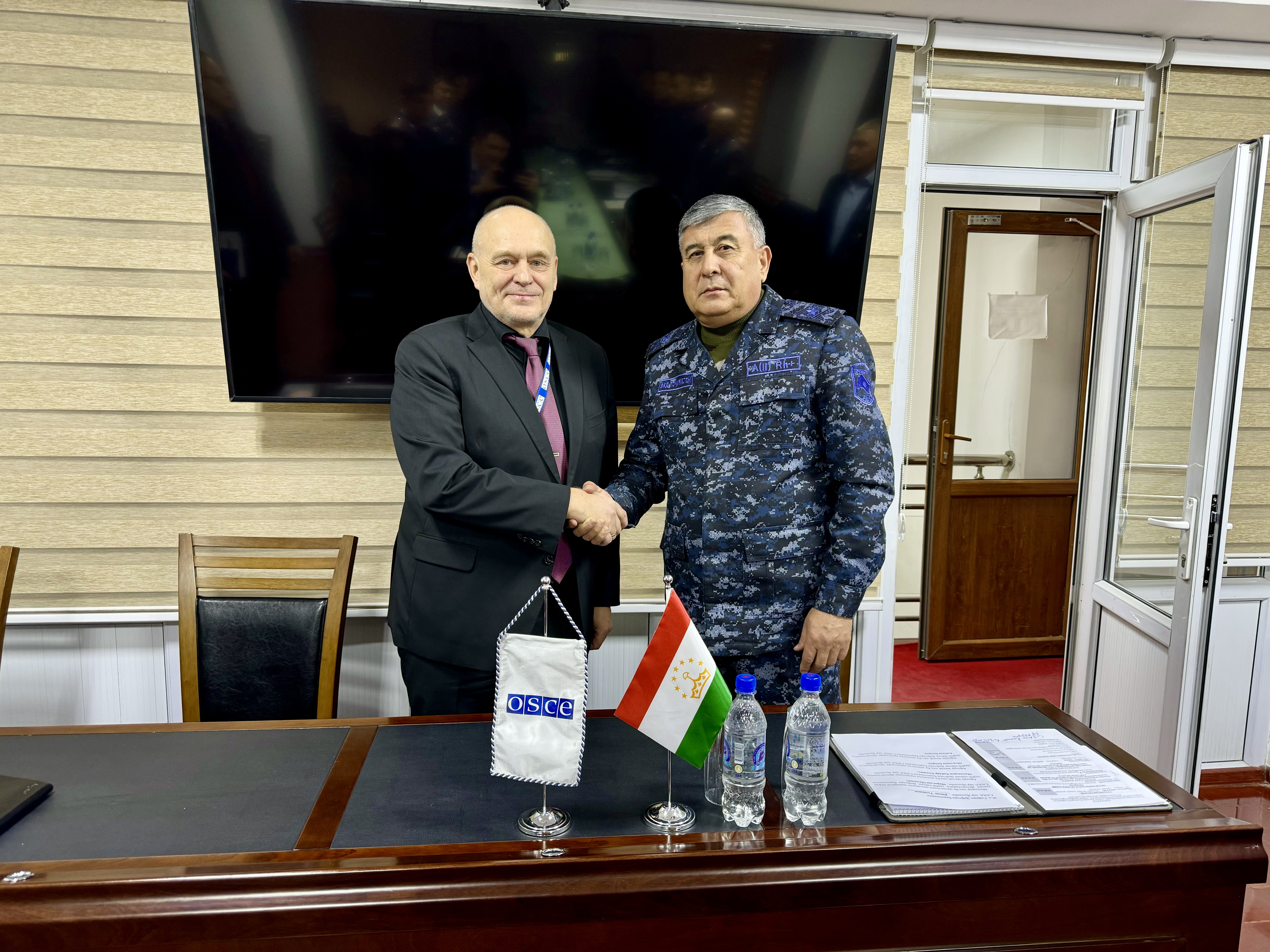 (слева направо) Юкка Туононен, Исполняющий обязанности Главы Программного офиса ОБСЕ в Душанбе и генерал-майор Насимзода Акбар Гиёс, Заместитель министра внутренних дел Республики Таджикистан позируют для фото во время встречи по улучшению работы сети Мобильных приемных милиции, Душанбе, 7 февраля 2024 года.