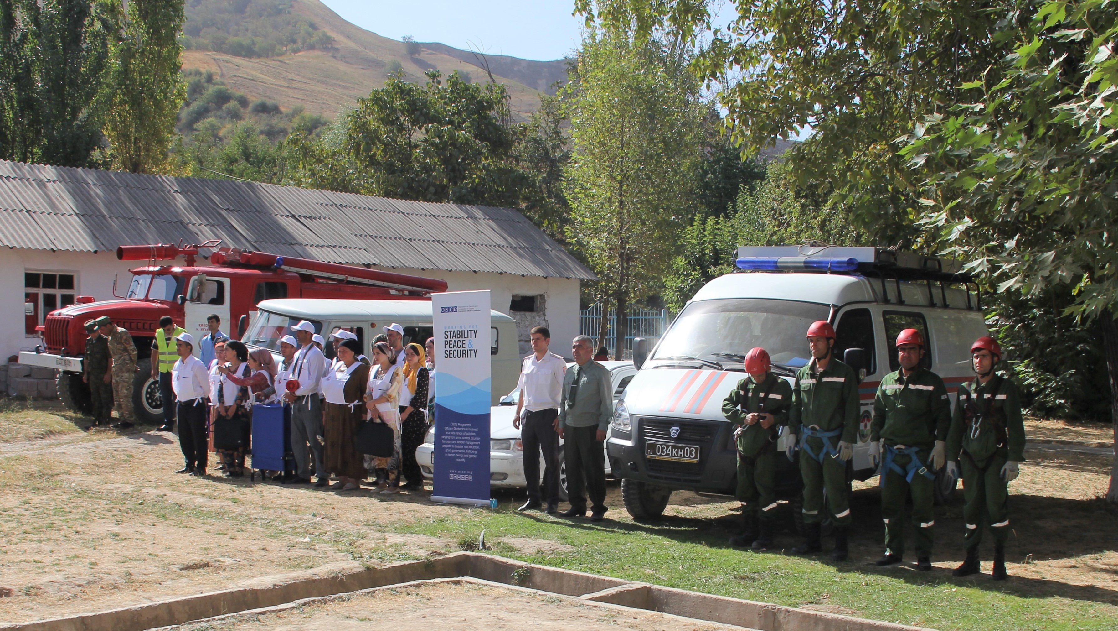 Жители села Саричашма в подверженном стихийным бедствиям Муминабадском районе во время тренинга по готовности, управлению и смягчению последствий стихийных бедствий, Муминабадский район, Республика Таджикистан, 6 сентября 2023 года.