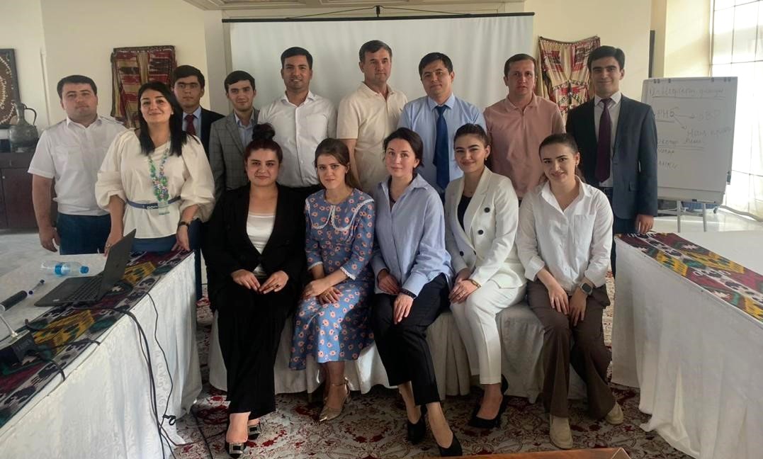 Представители различных министерств и ведомств позируют для группового фото на двухдневном тренинге по основам международной торговли и логистики, Душанбе, 14 сентября 2023 года.