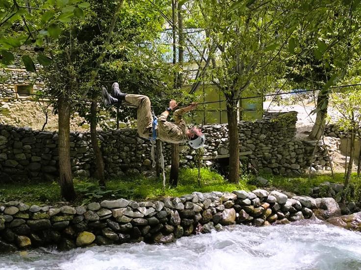 Офицер Спецподразделения Пограничных войск Республики Таджикистан во время практического занятия по наведению веревочного моста через реку в рамках месячного учебного курса «Укрепление оперативного потенциала на местах», Калаи Хумб, Дарвоз, Горно-Бадахшанская автономная область, 20 июня 2024 года.