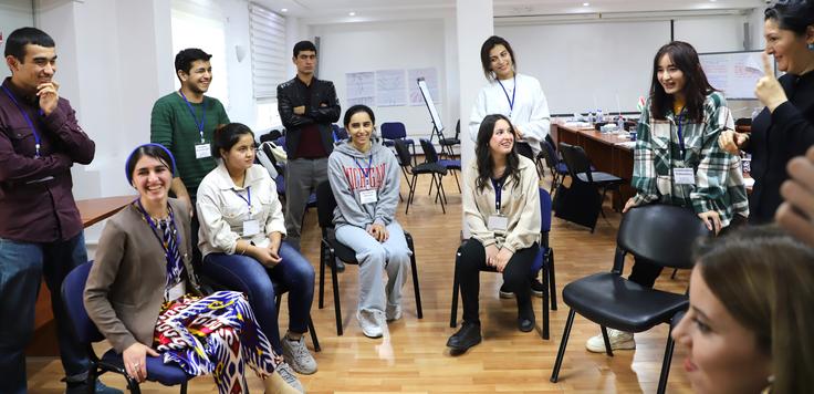 Молодые люди из Душанбе и регионов Республики Таджикистан во время трехдневного курса подготовки инструкторов по вопросам домашнего насилия, Душанбе, 18 октября 2023 года.