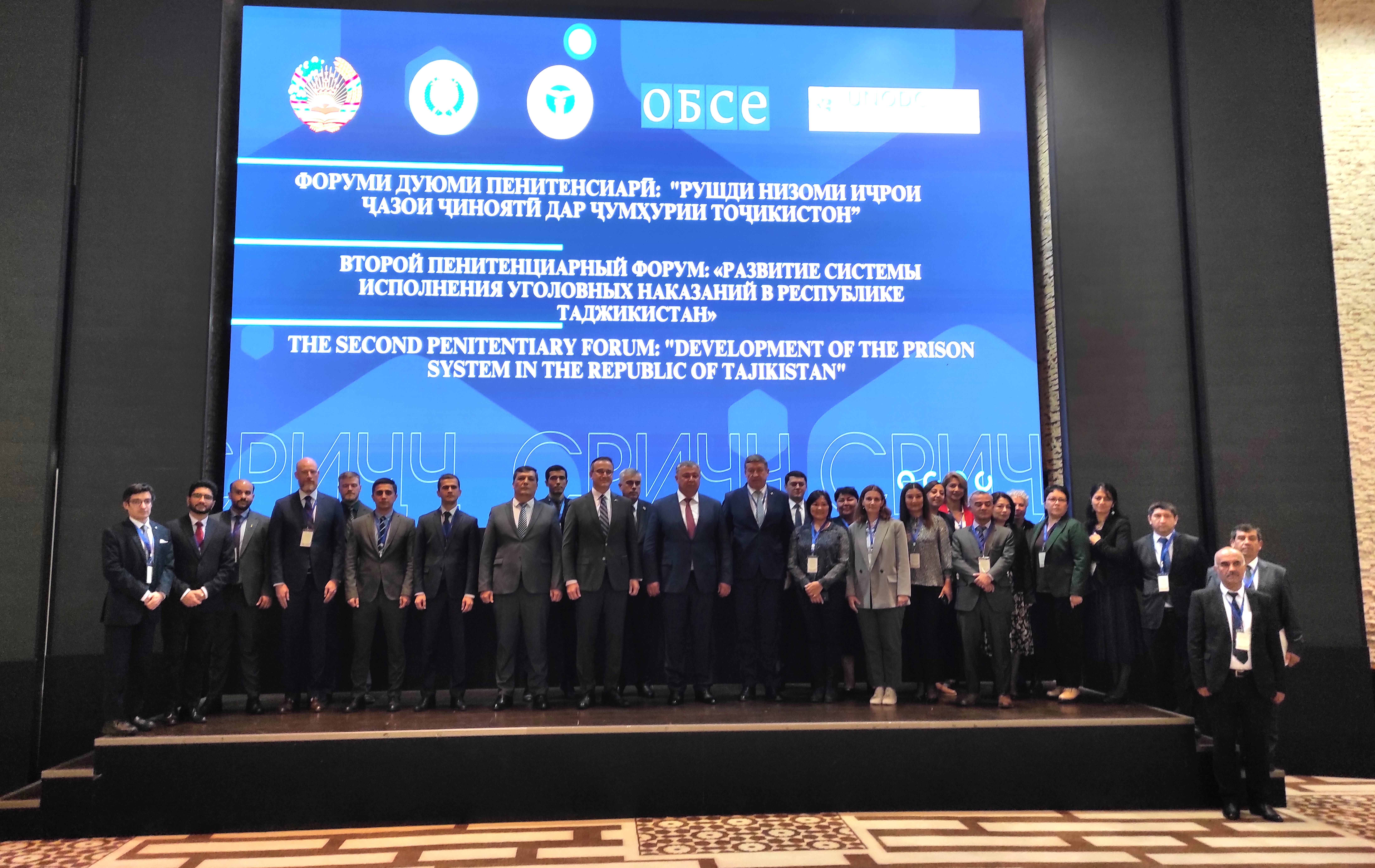 Эксперты, представители гражданского общества и государственные чиновники позируют для группового фото на втором форуме по пенитенциарной реформе в Республике Таджикистан, проведенном при поддержке Программного офиса ОБСЕ в Душанбе, Главного управления исполнения уголовных наказаний Министерства юстиции Республики Таджикистан и Управления ООН по наркотикам и преступности, Душанбе, 23 октября 2023 года.