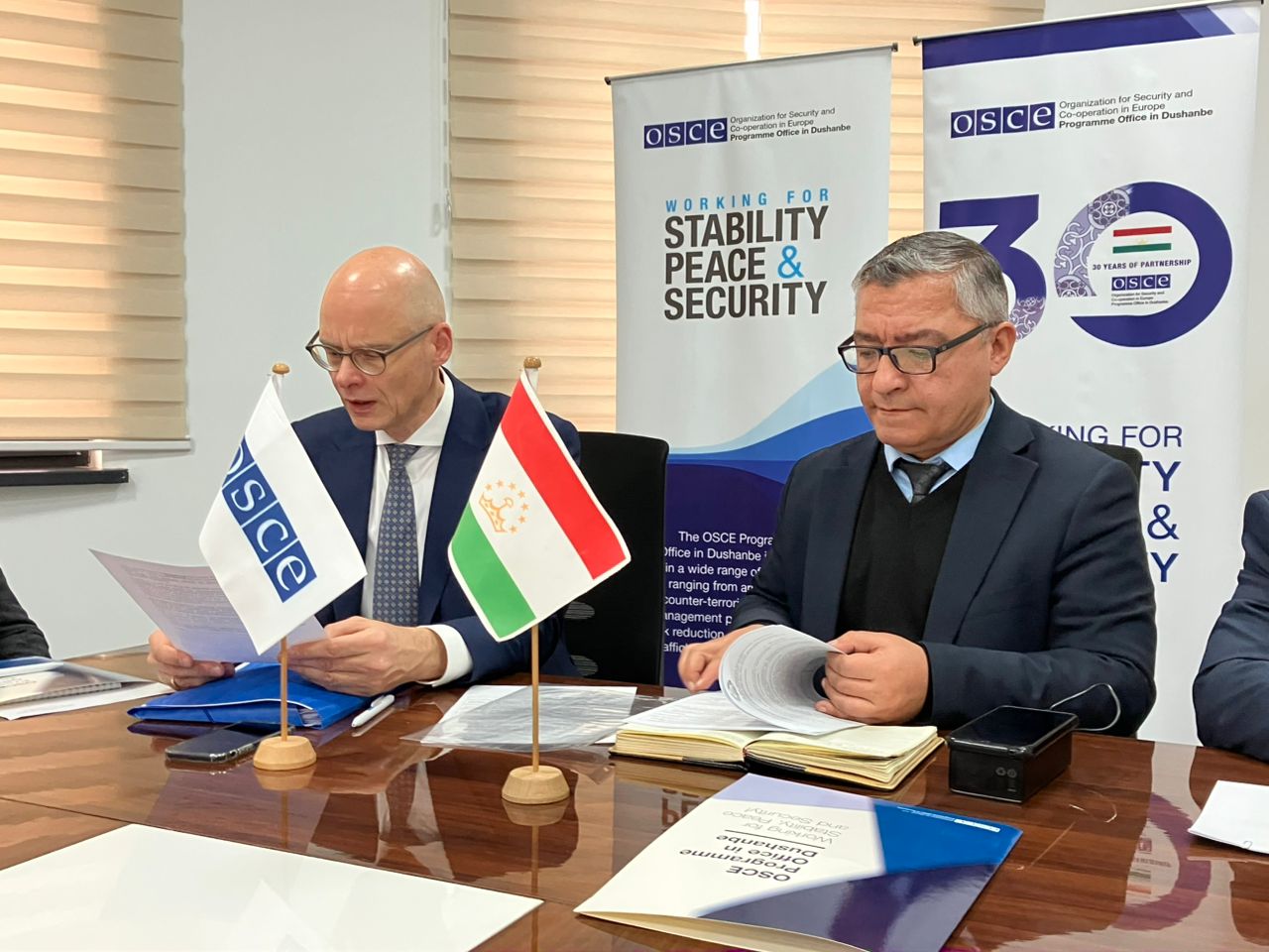 Штефан Ханиш (слева), исполняющий обязанности руководителя Департамента экономики и окружающей среды Программного офиса ОБСЕ в Душанбе, и доктор Навруз Джафаров (справа), заместитель начальника Службы государственного санитарно-эпидемиологического надзора Министерства здравоохранения и социальной защиты, принимают участие в однодневном круглом столе «Стандартные нормативные требования по контролю качества сточных вод», Душанбе, 20 декабря 2024 года.