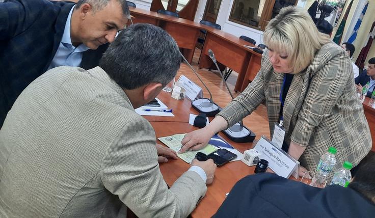 Офицеры Пограничных войск Республики Таджикистан и международный эксперт из Беларуси обмениваются мнениями о различных типах проездных документов и методах выявления подделок в ходе недельной программы подготовки ОБСЕ по проверке подлинности документов безопасности, Душанбе, 25 февраля 2025 года.