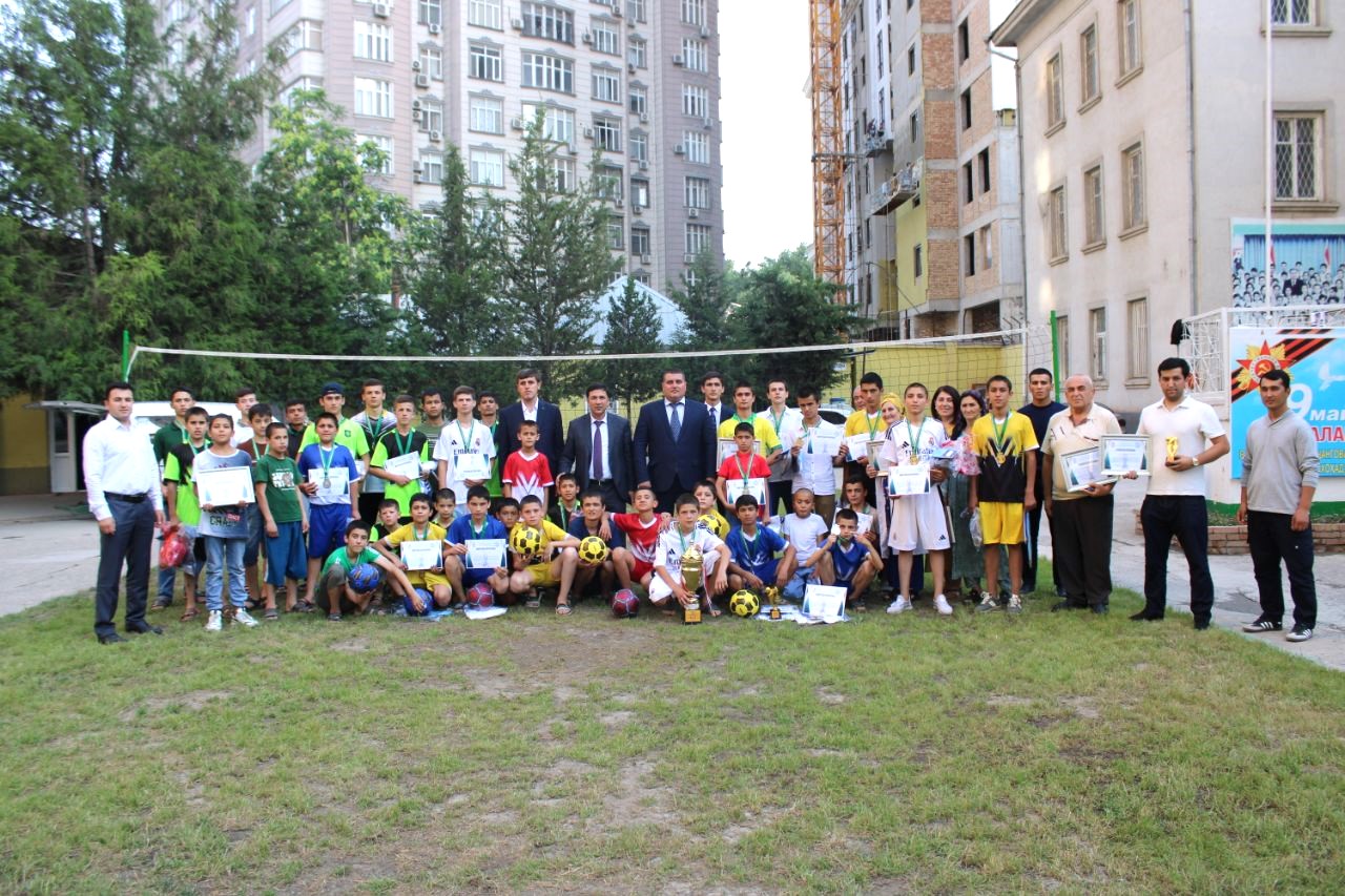 Молодежь из Бохтара позирует для группового фото с сувенирами и призами после футбольного матча, проведенного в рамках общественной информационно-просветительской кампании «Молодежь против наркомании, бродяжничества и хулиганства» по всей Республике Таджикистан, организованной Министерством внутренних дел Республики Таджикистан в сотрудничестве с Программным офисом ОБСЕ в Душанбе, 12 июня 2025 года.
