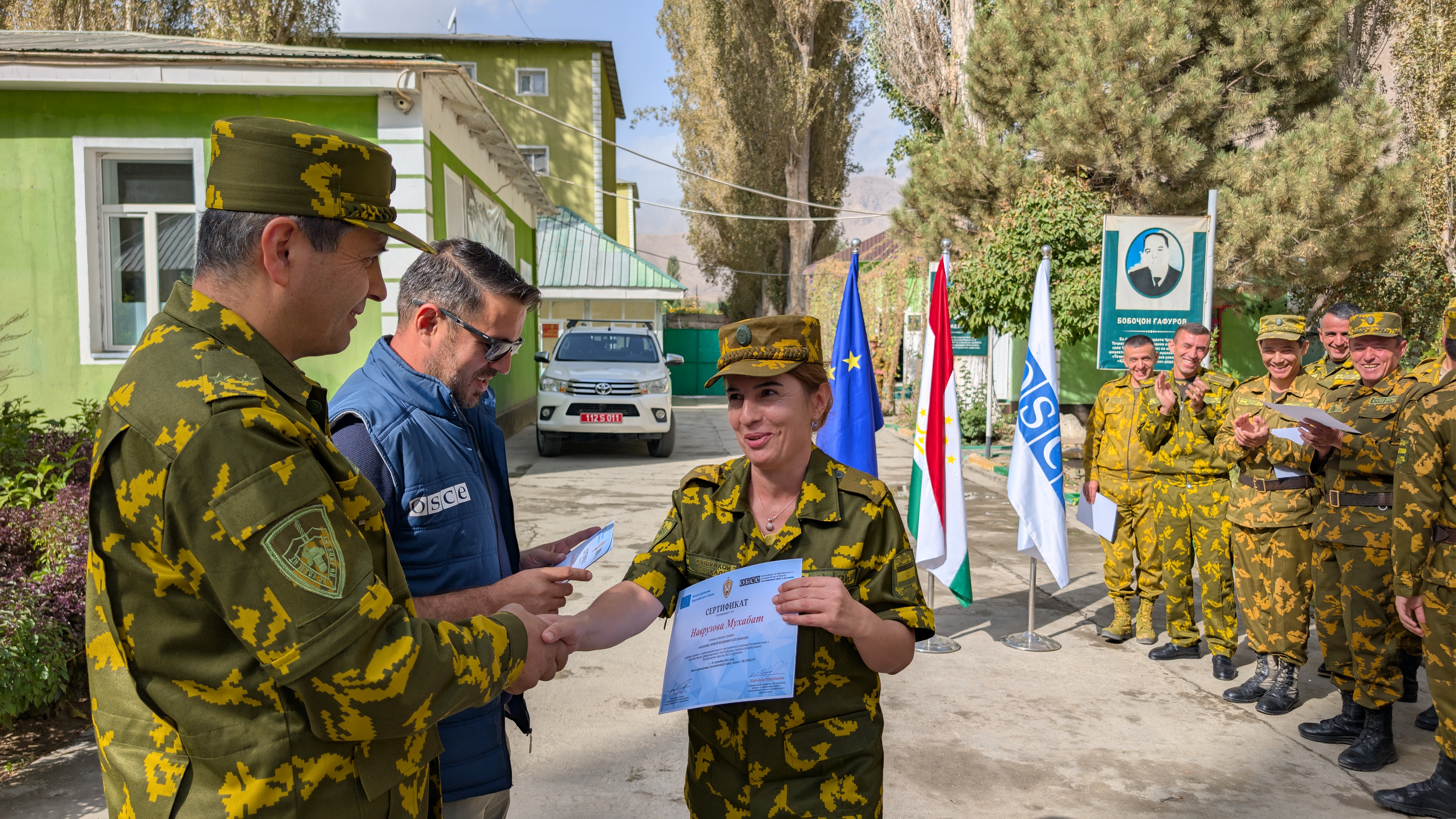 Мухабат Наврузова, сотрудник Пограничной службы Государственного комитета национальной безопасности Республики Таджикистан, получает сертификат о завершении четырёхнедельного курса, организованного ОБСЕ при финансовой поддержке ЕС, по укреплению медицинского потенциала в Хороге, ГБАО, 26 сентября 2025 года.