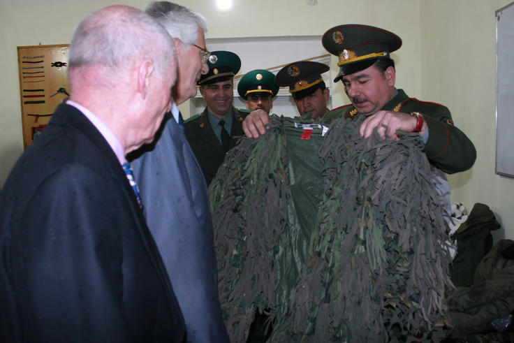 Lieutenant General Sherali Mirzo and Ambassador Ivar Vikki, the Head of the OSCE Office in Tajikistan, examine the samples of ghillie suits at the OSCE Patrol Programming and Leadership Project Training Center, Gissar, 9 April 2012.