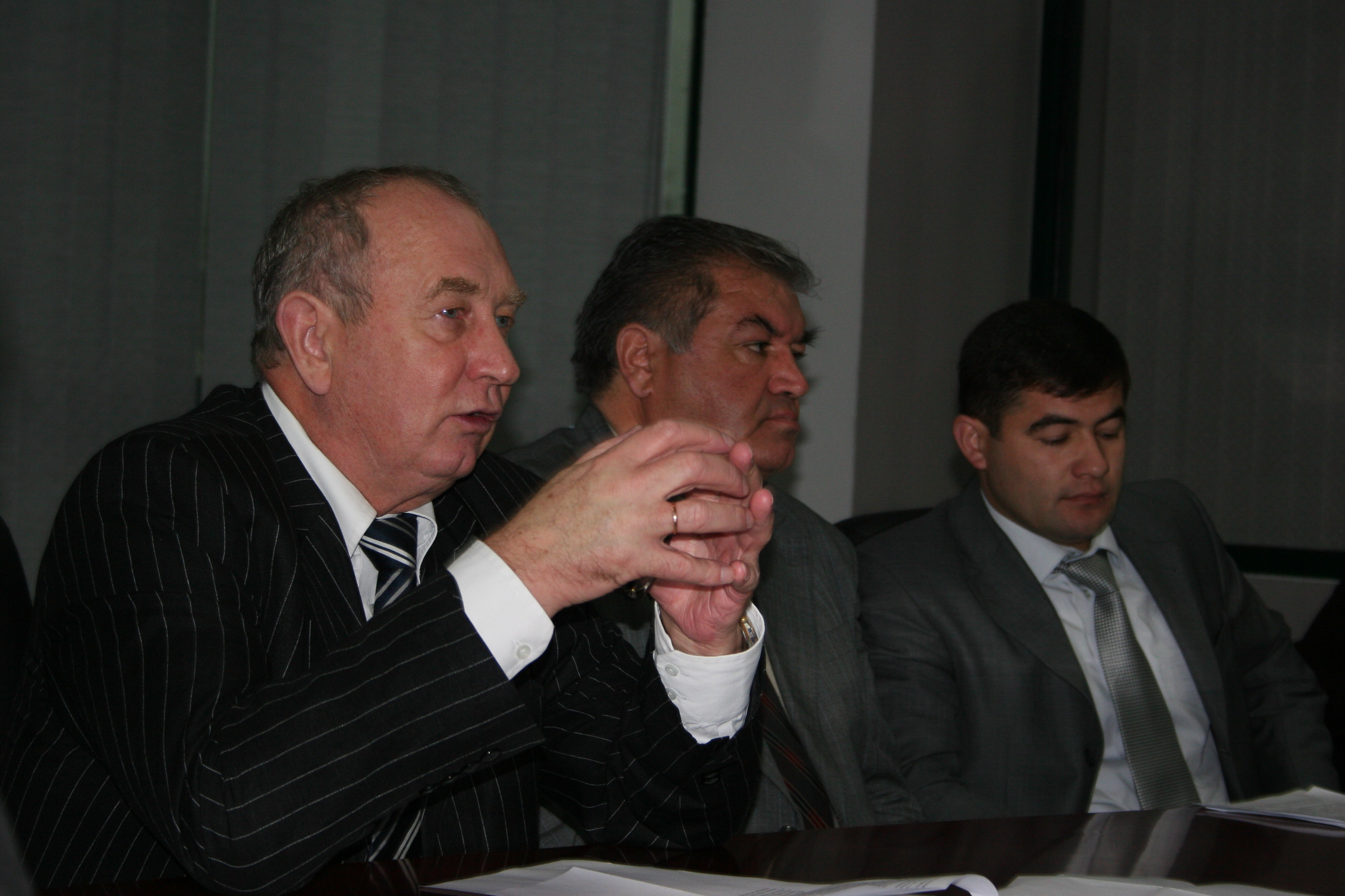 L-r: Amb. Vladimir Pryakhin, Head of the OSCE Office in Tajikistan; Nazribekov Rozikbek of the MoI's organized crimes board; and Alisher Tukhtaev of the government inter-agency commission at an anti-trafficking training course, 17 December 2008.