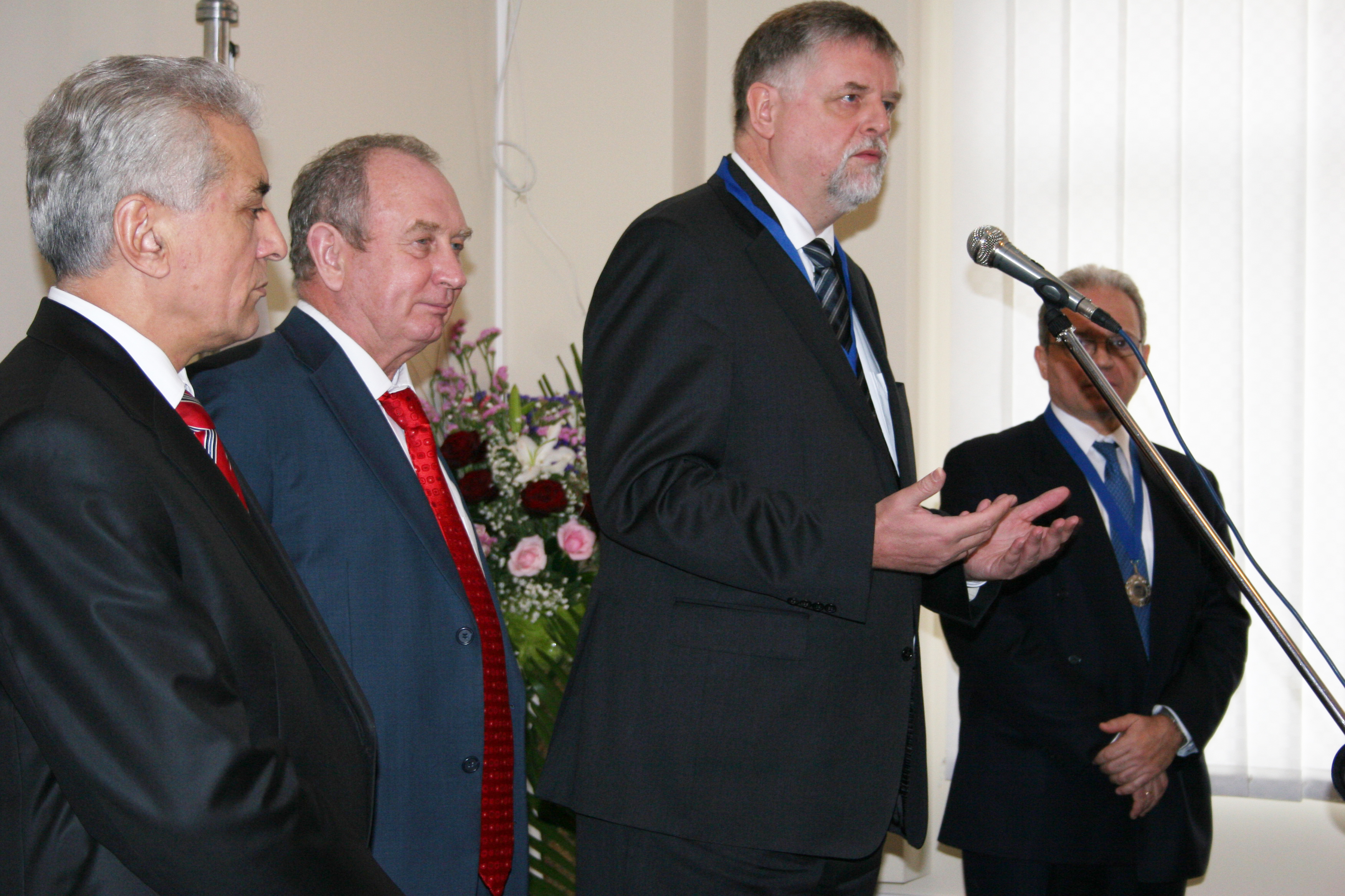 L-r: Tajik Foreign Minister Hamrokhon Zarifi; Head of the Office in Tajikistan Vladimir Pryakhin; CPC Director Herbert Salber, and Greek Chairmanship representative Louis-Alkiviadis Abatis at a ceremony marking the Office's 15th anniversary, 19 Feb 2009.