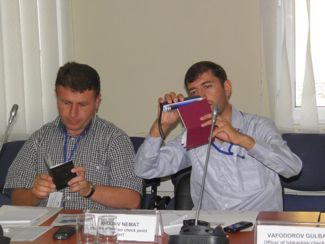 Tajik border officers Masrur Kurbonbekov (l) and Nemat Kholov take part in an OSCE training course on detecting forged travel documents and combating illegal border crossings, Dushanbe, 20 August 2013.
