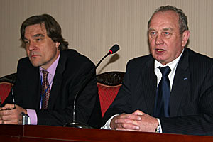 Ambassador Vladimir Pryakhin (r), Head of the OSCE Office in Tajikistan and Finnish MP Kimmo Kiljunen, the OSCE PA Special Representative for Central Asia, at a parliamentary seminar in Dushanbe, Tajikistan, 16 April 2009.