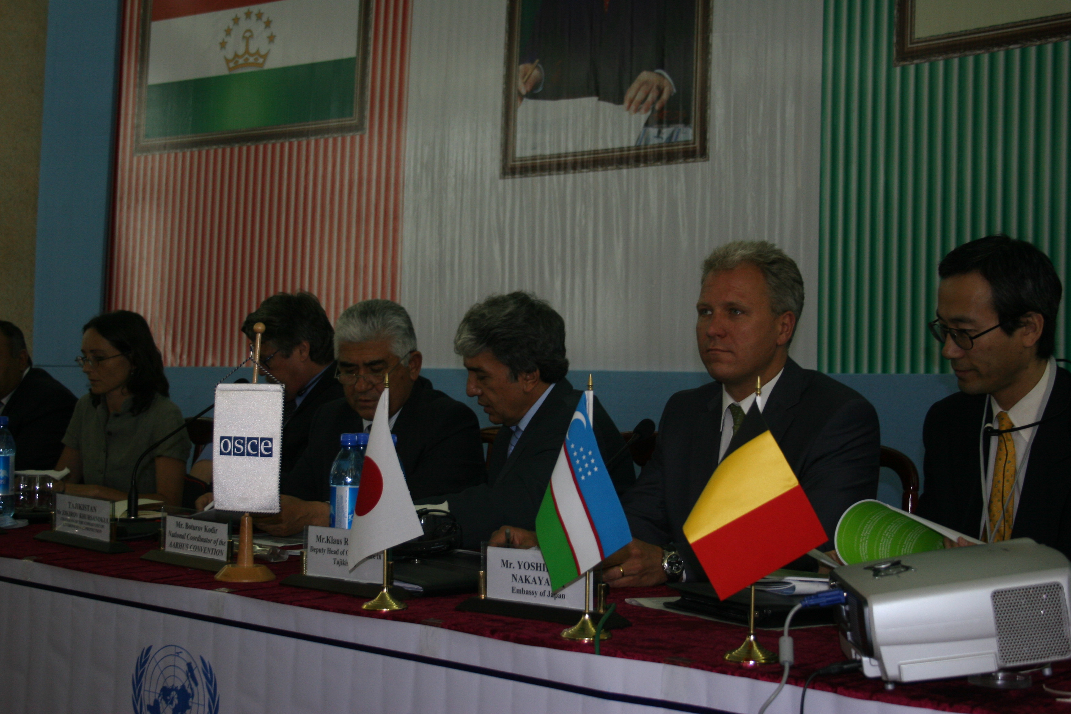 Yoshikhiro Nakayama, Ambassador of Japan (r); Klaus Rasmussen, Deputy Head of the OSCE Office (c); Kodir Boturov, National Co-ordinator, Aarhus Convention (l) at the Conference on the Protocol on Pollutant Release, Dushanbe, 21 May 2009.