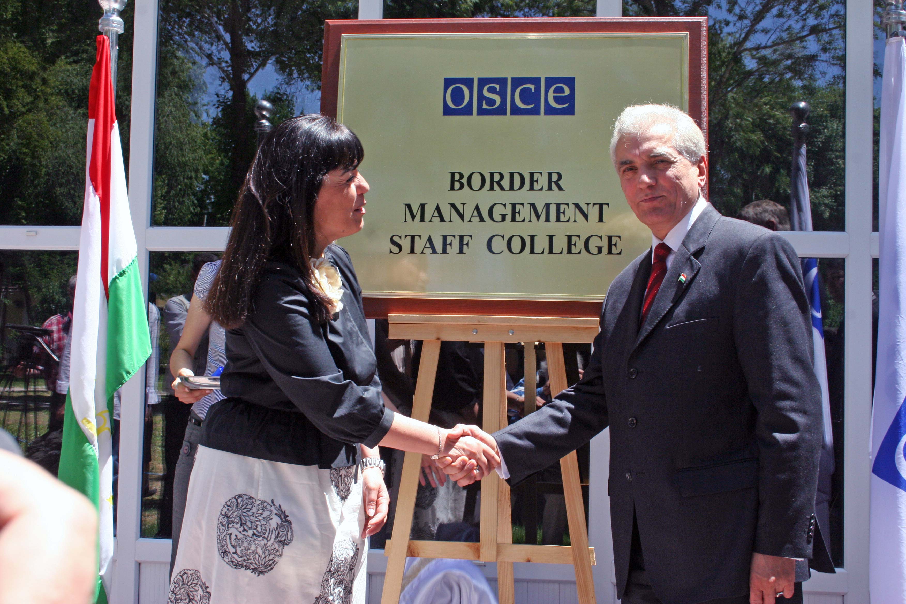Chairperson of the OSCE Permanent Council, Ambassador Mara Marinaki (left), and Hamrokhon Zarifi, Tajik Foreign Minister, at the launch ceremony of the OSCE Border Management Staff College, Dushanbe, 27 May 2009.