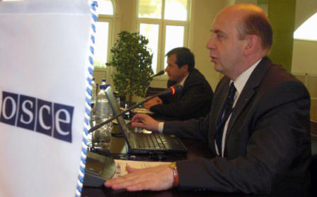 Eric Svanidze (r), Council of Europe human rights expert and Abdullojon Soliev from the Department of Constitutional Guarantees and Citizens' Rights at a OSCE-supported detention monitoring seminar, Dushanbe, 27 May 2009.