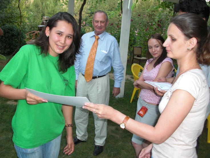 Nargis Zokirova (r), Head of the Bureau of Human Rights and Rule of Law, a Tajik NGO, presents a certificate to one of the university students who completed an OSCE-sponsored course in human rights held in Almasi, 29 July 2009.