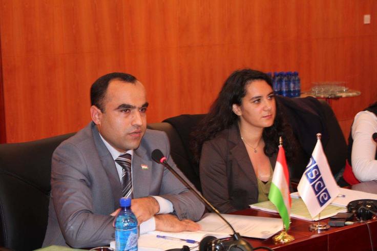 L-r: Atham Abdulloev, Secretary of the Inter-Agency Commission on Combating Trafficking in Human Beings, and Graziella Piga, Gender and Anti-Trafficking Officer, at a roundtable on trafficking supported by the OSCE Office in Tajikistan, 17 November 2009.