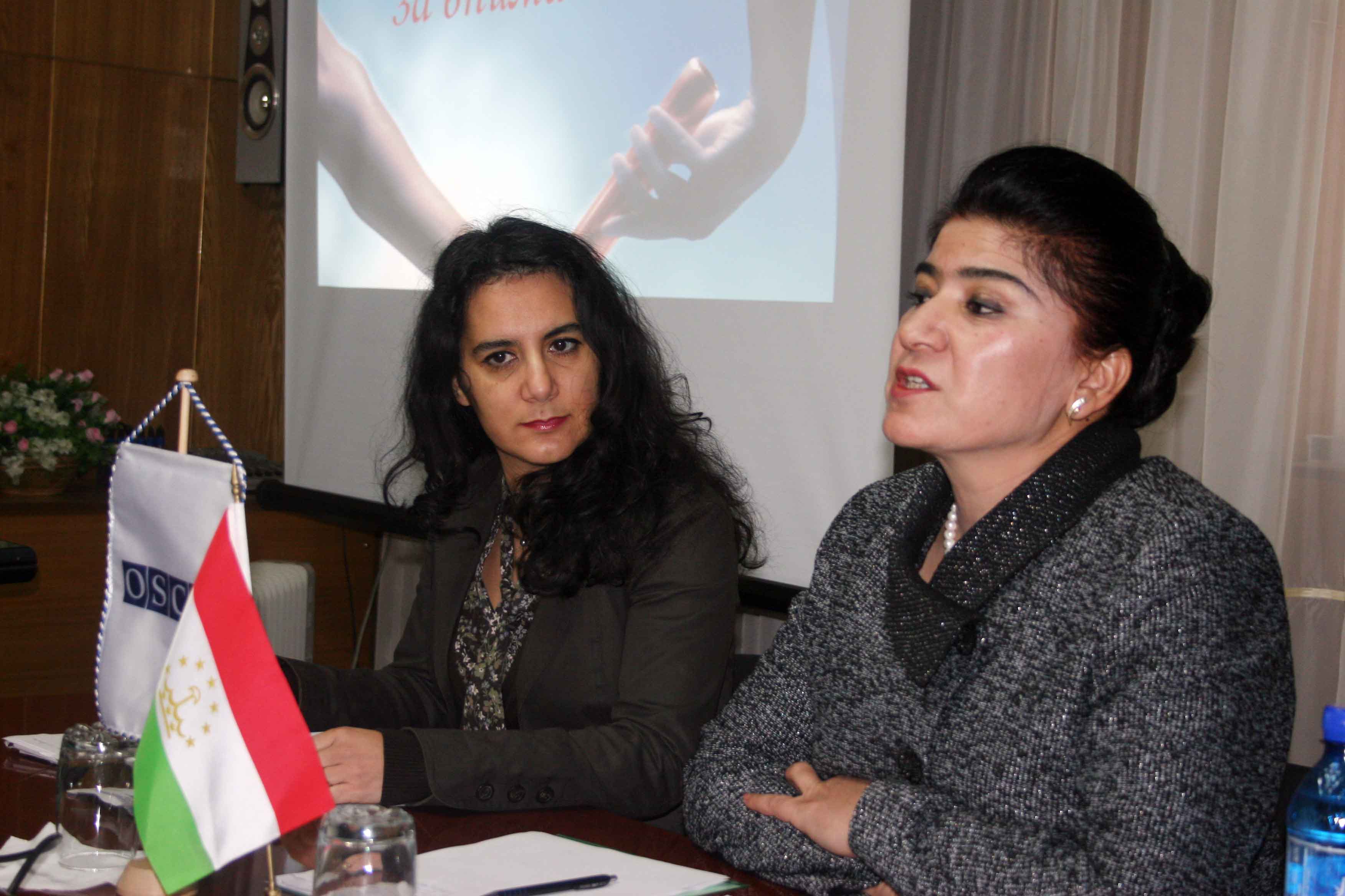 Khairinisso Yusufi (r), Chairperson of the Tajik National Committee on Women and Family Affairs with Graziella Piga, Gender and Anti-Trafficking Officer of the OSCE Office in Tajikistan, Dushanbe, 16 December 2009.