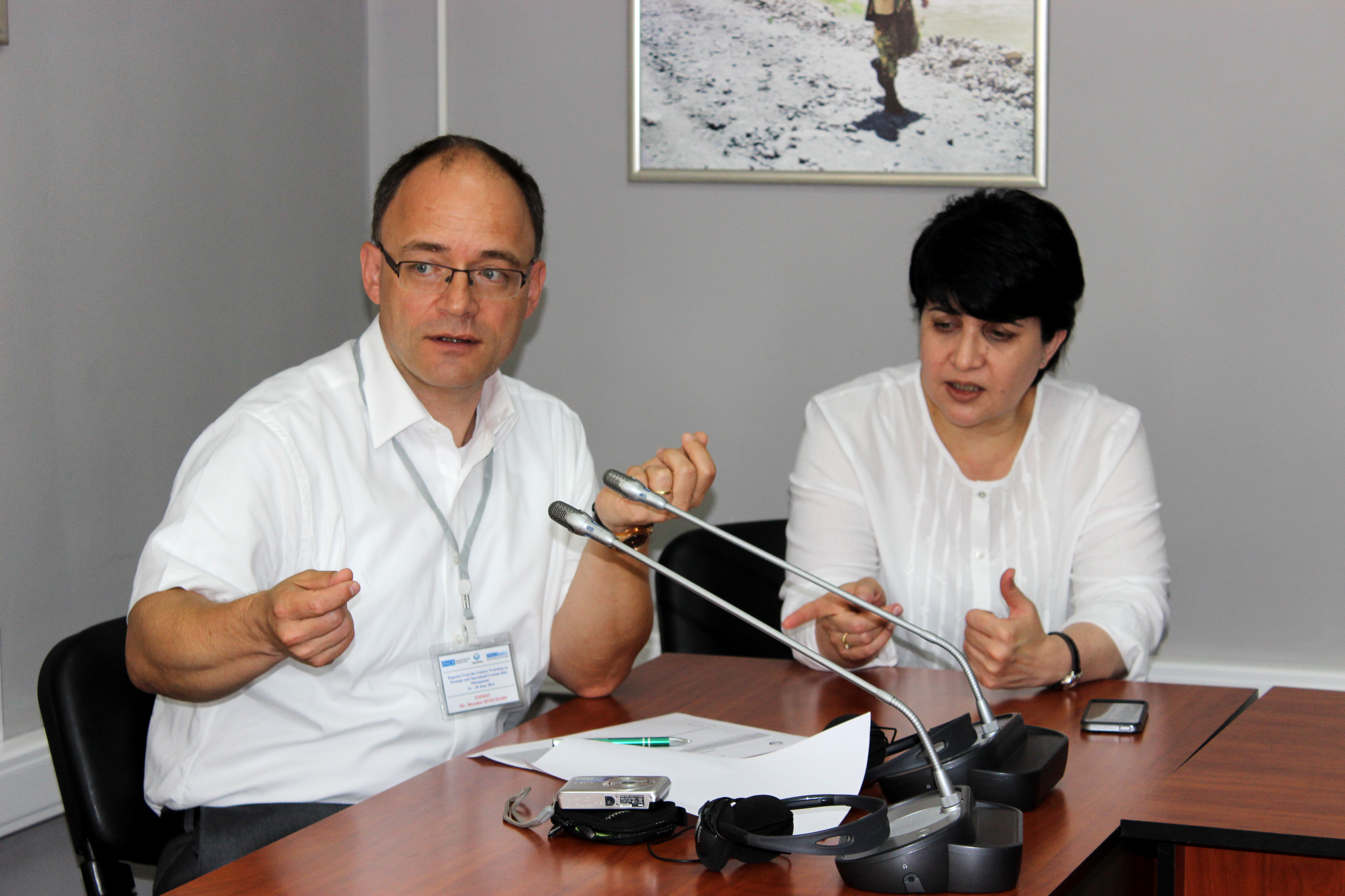 Expert from the Federal Swiss Customs representing the current OSCE Chairmanship, Miroslaw Ritschard (l) facilitates a scenario-based simulation on risk identification at the OSCE Border Management Staff College, Dushanbe, 16 June 2014.