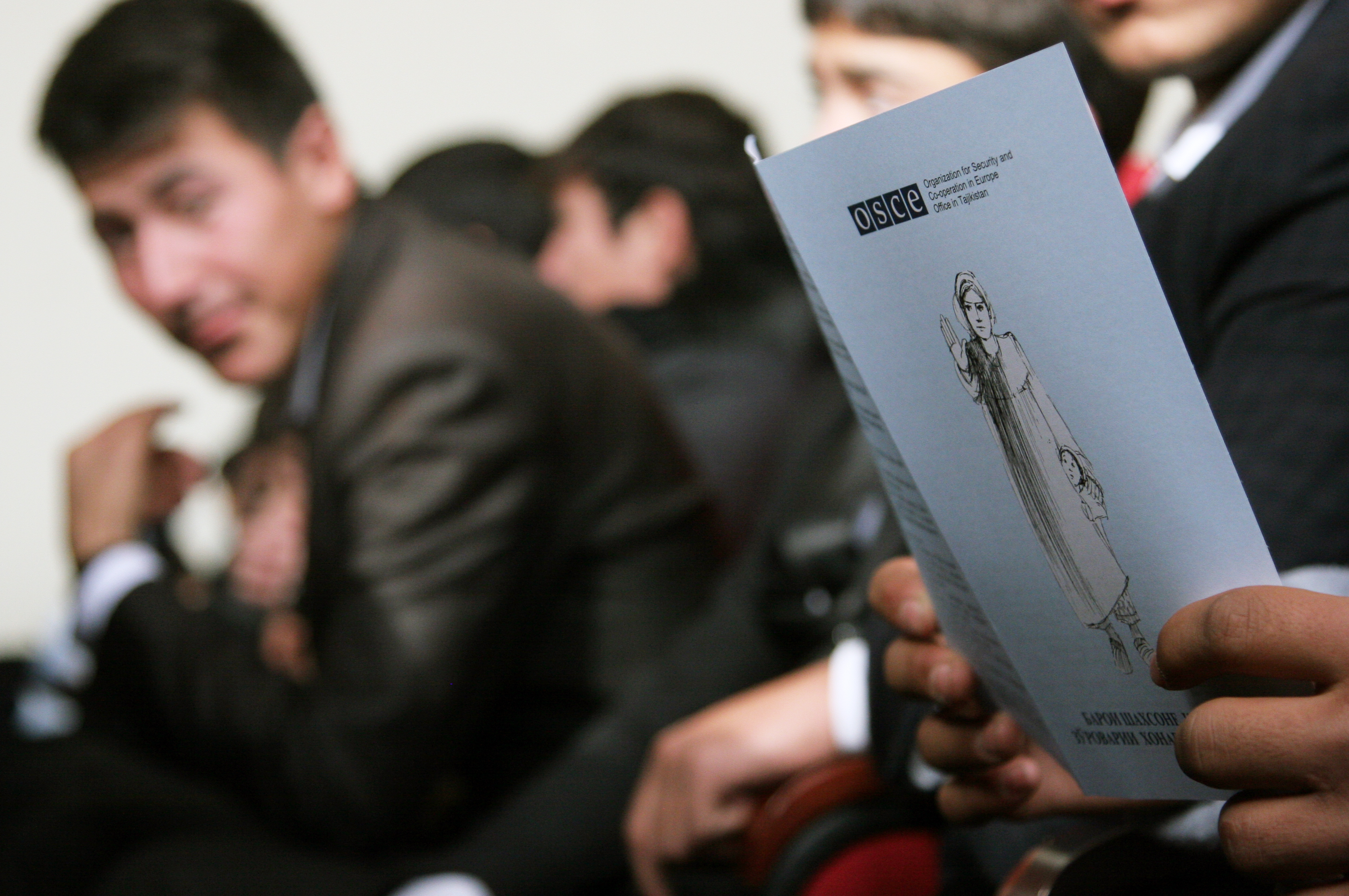 A student holding an information bulletin “For those who have been subjected to domestic violence”, the publication of which was supported by the OSCE Office in Tajikistan for dissemination in towns and remote areas of Tajikistan, Khuroson District, Ayni Jamoat of Kurgan-Tube, December 2014.