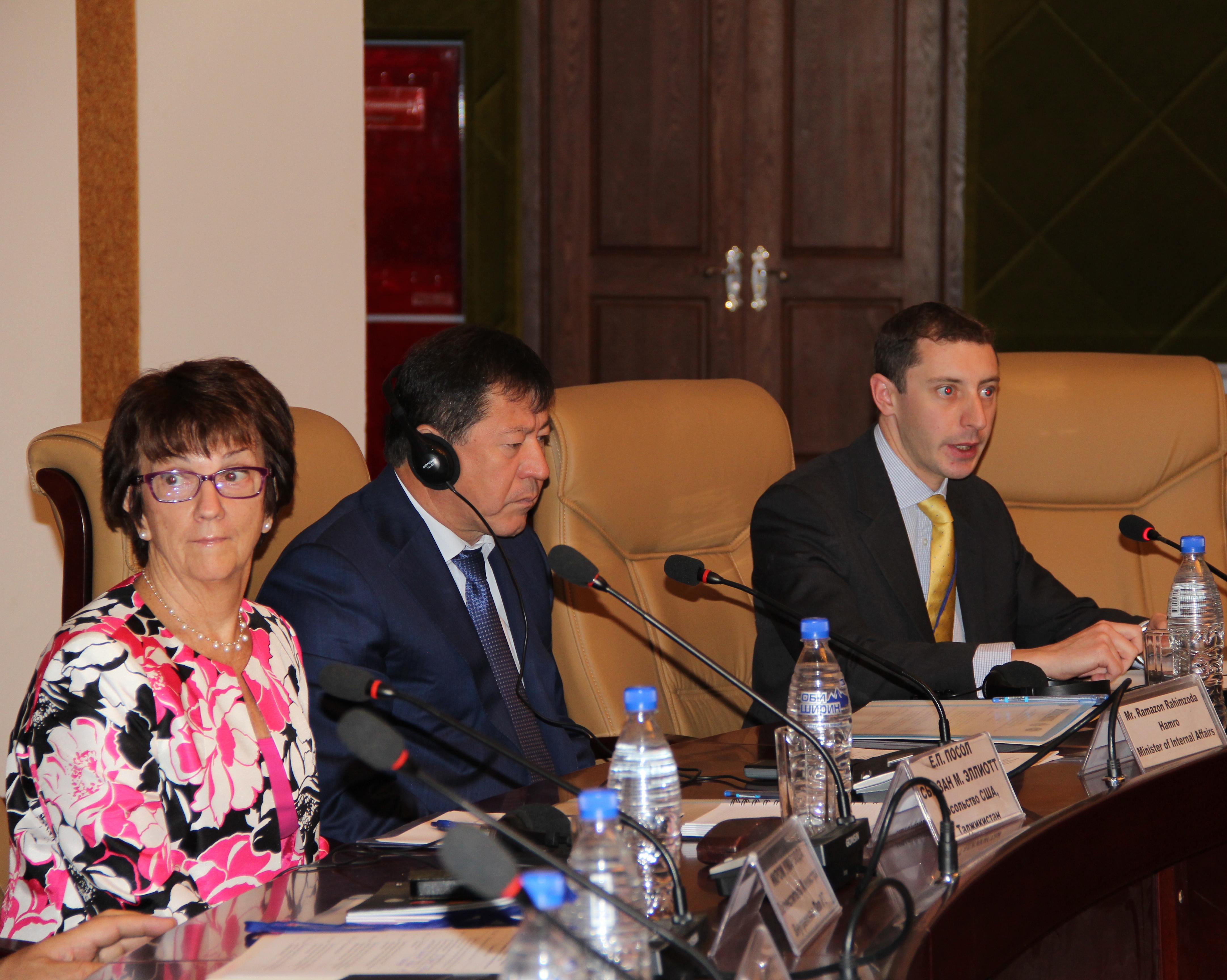 U.S. Ambassador to Tajikistan Susan M. Elliott (l), the Interior Minister of Tajikistan, Lieutenant General Rahimzoda Ramazoni Hamro (c), and Sean McGreevy (r), Senior Executive Officer at the OSCE Office in Tajikistan, speaking at community policing workshop, Dushanbe, 27 April 2015.
