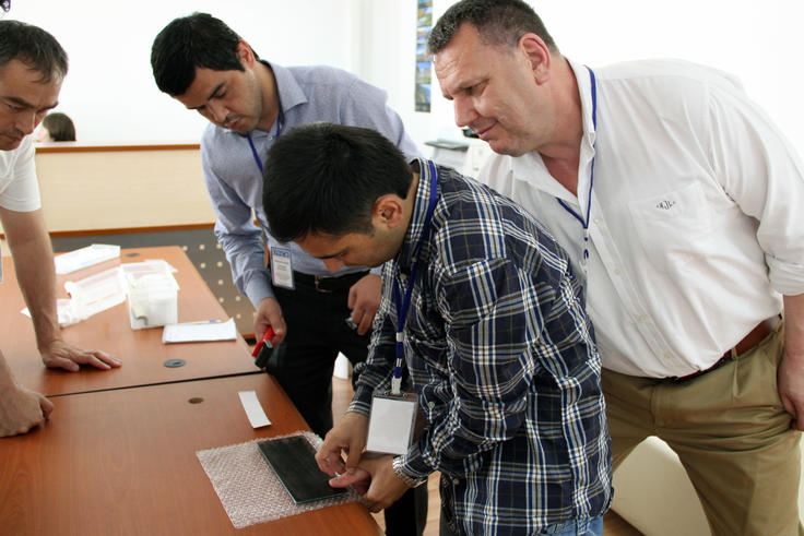 Robert Lamburne, expert from the United Kingdom (r), alongside training participants during practical exercises documenting the crime scene, Dushanbe, 7 May 2015.