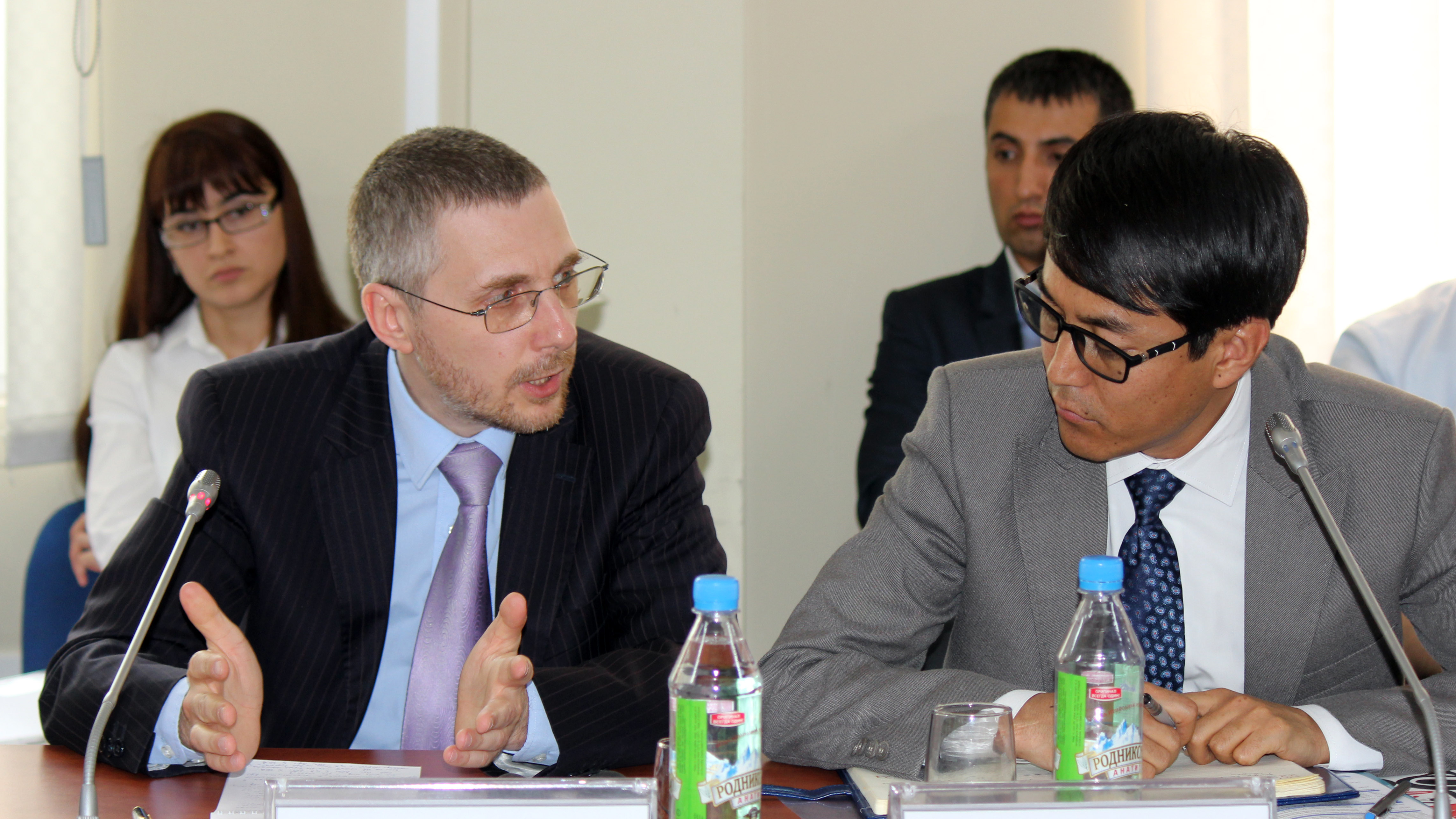 Ivan Safranchuk (l), of the Institute of Contemporary International Studies, Academy of Diplomacy of Russia, speaking at a roundtable discussion on Afghanistan - Central Asian Perspectives on Regional Security, Dushanbe, 28 May 2015.