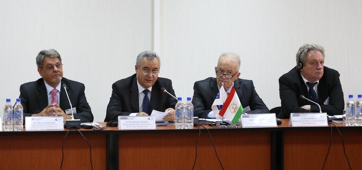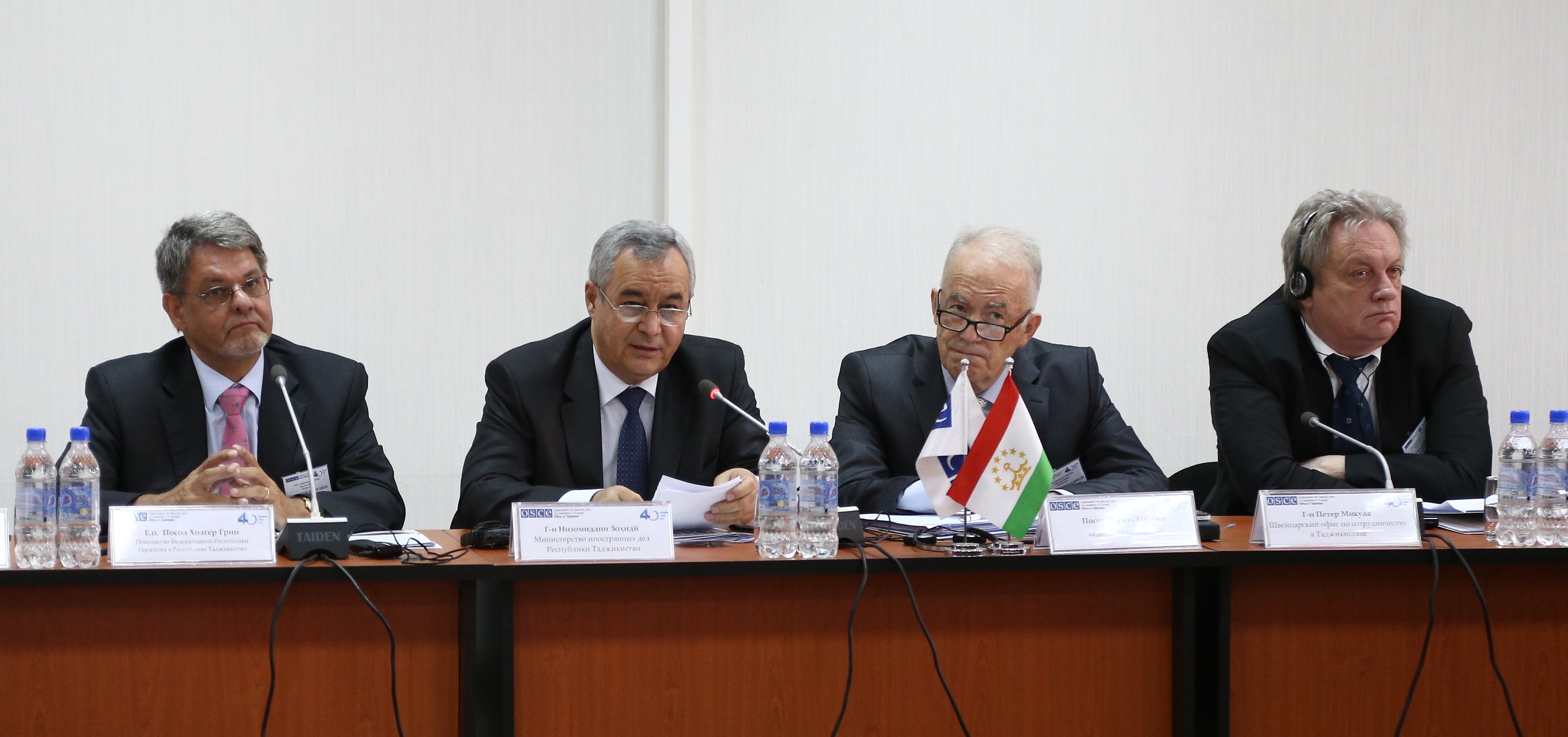 L-r: Holger Gren, German Ambassador to Tajikistan; Nizomiddin Zohidi, Deputy Minister of Foreign Affairs of Tajikistan; Ambassador Markus Mueller, Head of the OSCE Office in Tajikistan; and Peter Mikula, Country Director of Swiss Cooperation Office in Tajikistan, Dushanbe, 16 June 2015.
