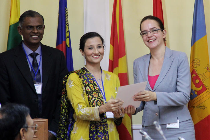 (L-r) Seevali Arukgoda, WCO Programme Associate, Saadia Sheeraz, participant from Pakistan, and Dita Nowicka, Director of OSCE Border Management Staff College, at the concluding ceremony of the ten-day train-the-trainer course for sixteen instructors from national customs training institutions, Dushanbe, 14 August 2015.