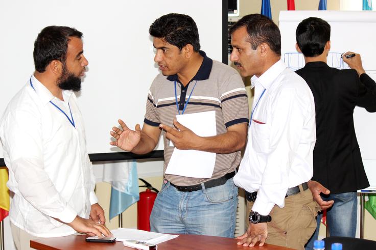 Afghan border officers taking part in the group exercise in the Border Management Awareness Course, Dushanbe, 3 September 2015.