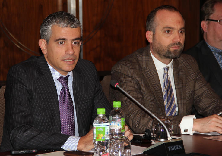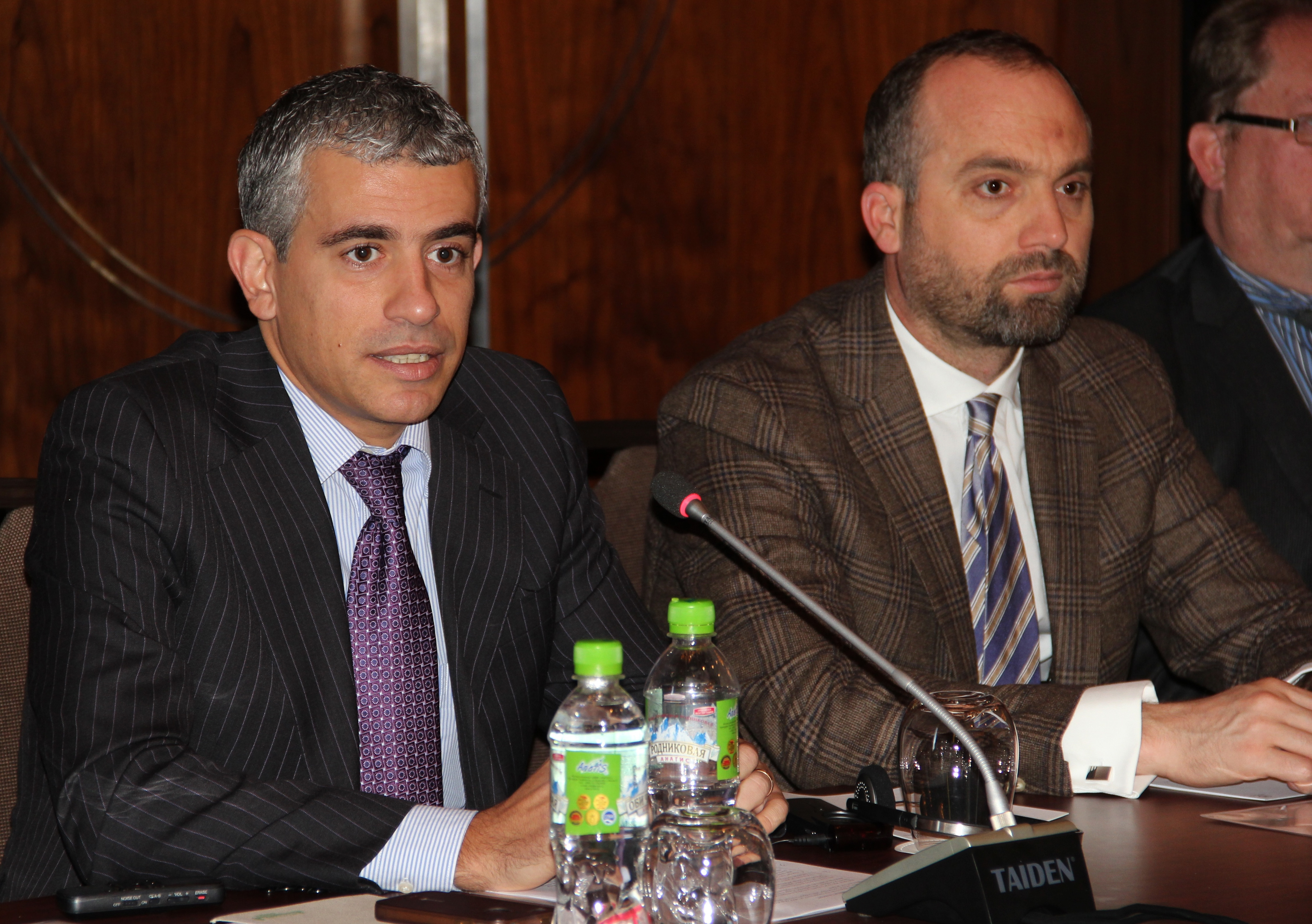 Deputy Head of the OSCE Office in Tajikistan Fabio Piana (l), and the Head of the Politico-Military Department of the OSCE Office in Tajikistan Fejzo Numanaj (r), speaking at a roundtable discussion on the lessons learned from the ‘Parents against Terrorism’ training project, Dushanbe, 28 October 2015.