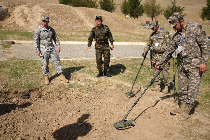 Tajik and Kazakh Explosive Ordnance Disposal specialists during a training course on Improvised Explosive Devices detection procedures with metal detectors, Lohur, Rudaki district, 29 September 2015.