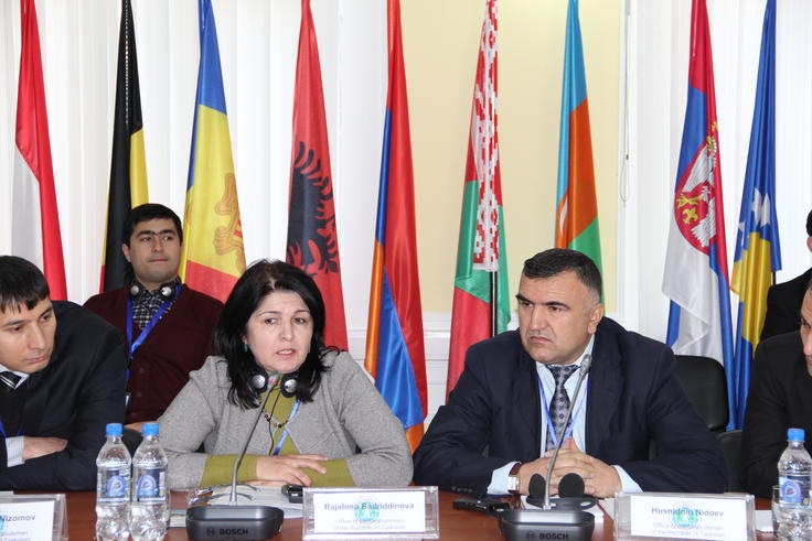 Rajabmo Badriddinova of the Office of the Ombudsman of the Republic of Tajikistan (c) speaking at a training course on the human rights of persons in police custody and the independent monitoring of police detention facilities, Dushanbe, 15 December 2015.