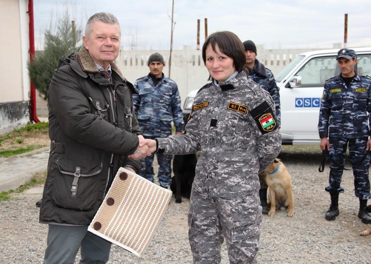 Wolfgang Nikolaus, Counter Terrorism and Police Issues Adviser at the OSCE Office in Tajikistan (l) and Elena Sargalieva, senior dog handler at K-9 Center (r) during a handover ceremony of the kits for training of sniffer (K-9) dogs, Dushanbe, 26 January 2016.