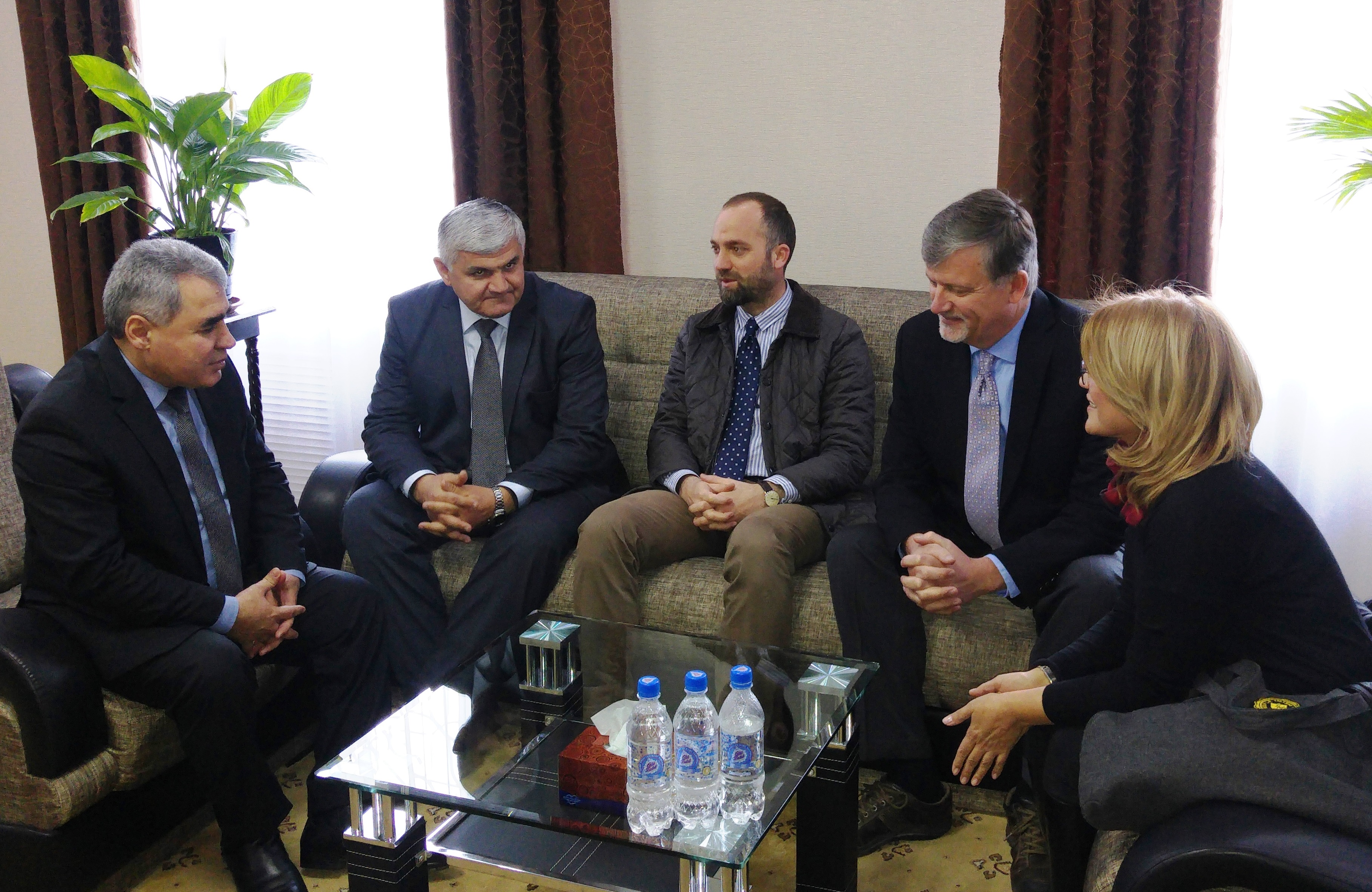 OSCE Office in Tajikistan's Head of the Politico-Military DepartmentFejzo Numanaj (centre); Alijon Bobonazarzoda, National Coordinator on Police Reform from Tajikistan’s Interior Ministry (centre-left), and James Berg, Criminal Justice Advisor at the US Bureau of International Narcotics and Law Enforcement Affairs (centre-right), during an opening ceremony of the Public Council office for police reforms, Khujand, 13 February 2016.