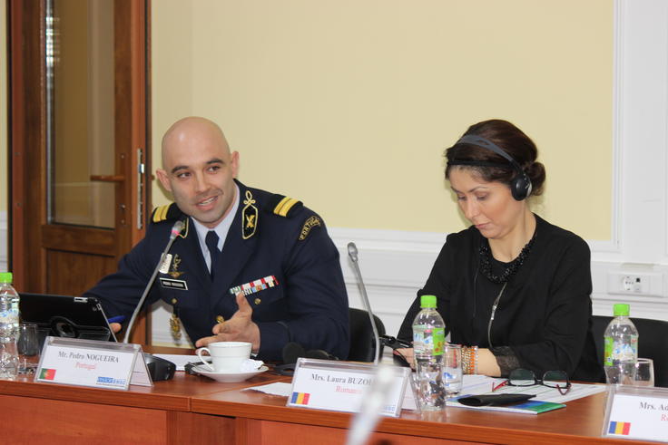 Pedro Nogueira, Deputy for the Strategic Planning and International Affairs Division at the Ministry of Internal Affairs of Portugal provides feedback on a practical exercise conducted during the Leadership and Management Course in Dushanbe, 18 March 2016.