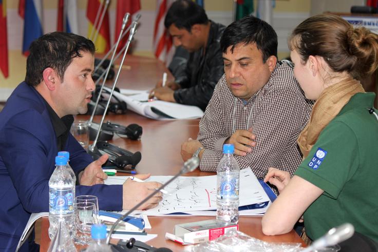 Sefatullah Rahmani (l), a trainer from the Afghan Border Police, discussing a lesson planning assignment with Nell Pates (r), an expert from the UNDP BOMNAF, Dushanbe, 14 April 2016.