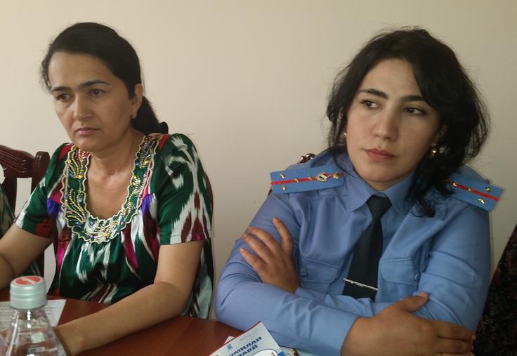 Marifat Khidiralieva, Director of NGO Marifat in Khuroson district (l) and Madina Sangova, Gender Sensitive Policing Officer in Kulyab (r), during a workshop for law enforcement agencies and civil society, Djaihun city, Khatlon region, 4 May 2016. (OSCE Mahbuba Mamadatokhonova)