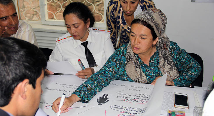 Working group members take part in simulation exercise on dealing with domestic violence, Garm, 28 July 2016.