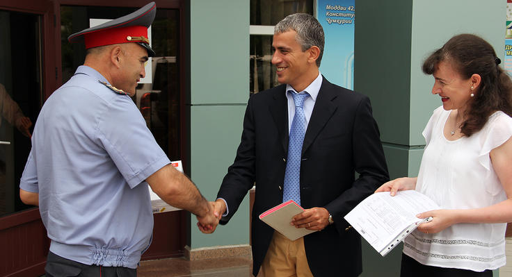 (l-r) Sharifzoda Mirzo, Deputy Head of the Police Academy of the Ministry of Internal Affairs, Fabio Piana, Deputy Head of the OSCE Office in Tajikistan and Viorelia Rusu, Gender and Anti-Trafficking Officer, during the equipment handover ceremony in the Police Academy of the Ministry of Internal Affairs, 29 July 2016.