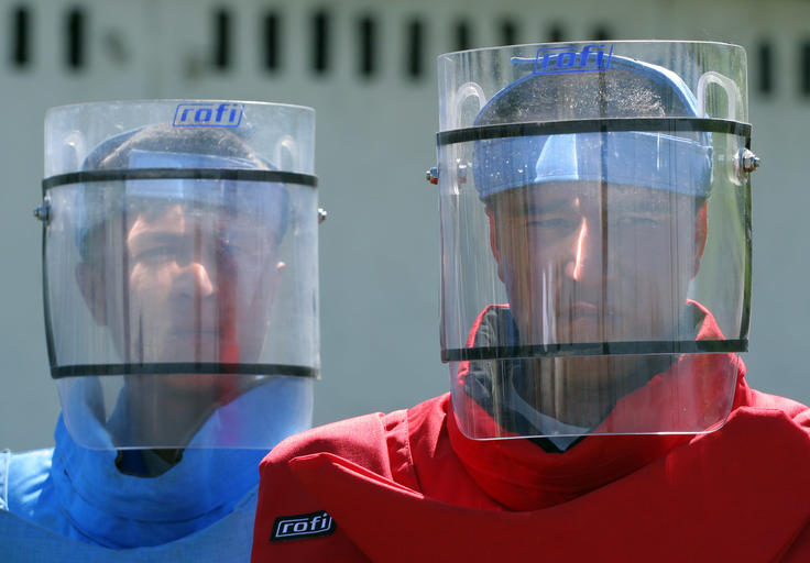 Experts wearing protective gear at a landmine training centre outside Dushanbe, 4 April 2006.