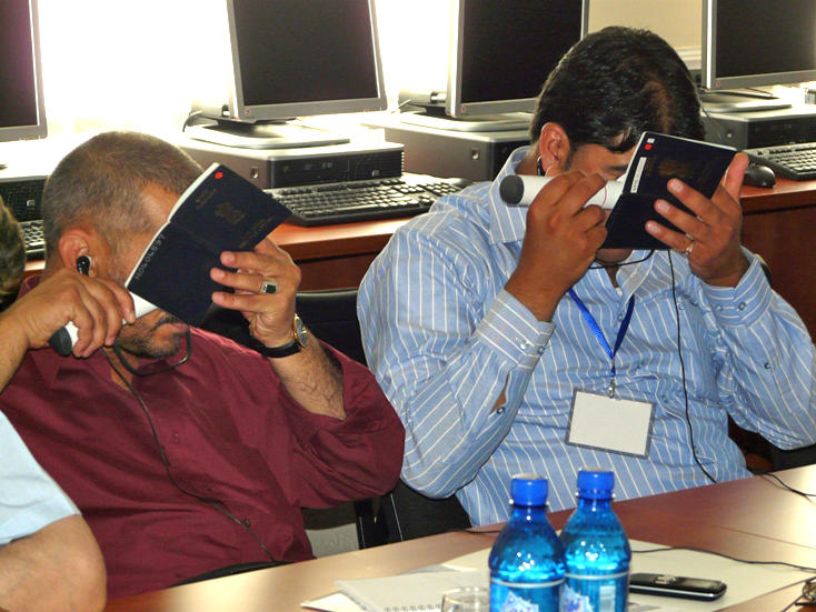 Participants use special equipment to detect forged documents during a workshop for high-ranking officers and government officials at the OSCE Border Management Staff College in Dushanbe, 7 July 2010.