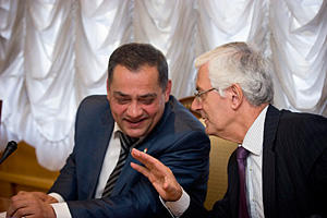 Zarif Alizoda (l), Human Rights Ombudsman of the Republic of Tajikistan, and Ambassador Ivar Vikki, Head of the OSCE Office in Tajikistan, talk at a human rights conference in Dushanbe, 10 December 2010.