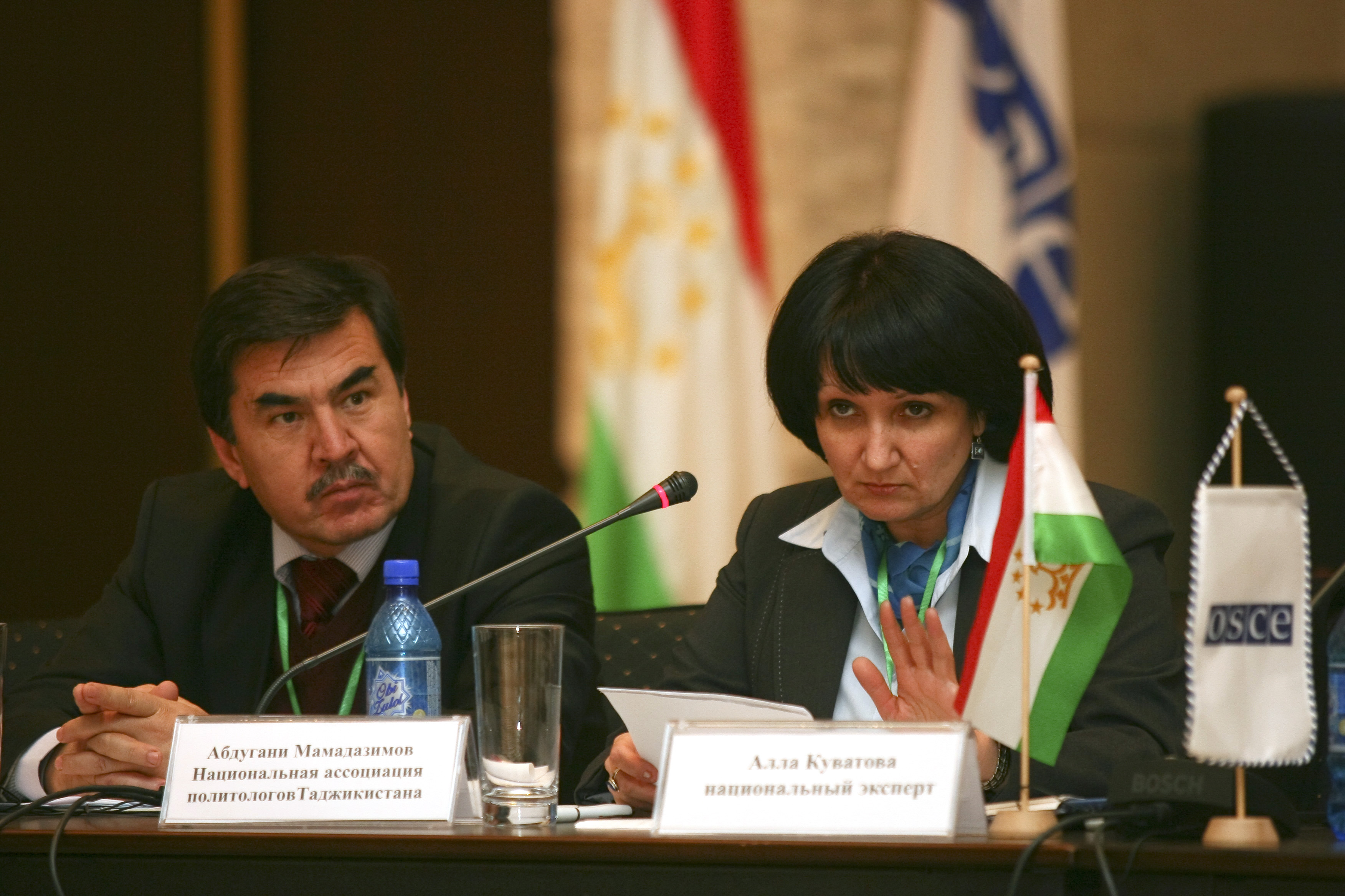 Abdugani Mamadazimov (l), National Association of Political Scientists of Tajikistan, listens as Alla Kuvatova, Coalition of NGOs for Gender Equality, presents a report on women's participation in Tajikistan's political life, Dushanbe, 11 December 2010.