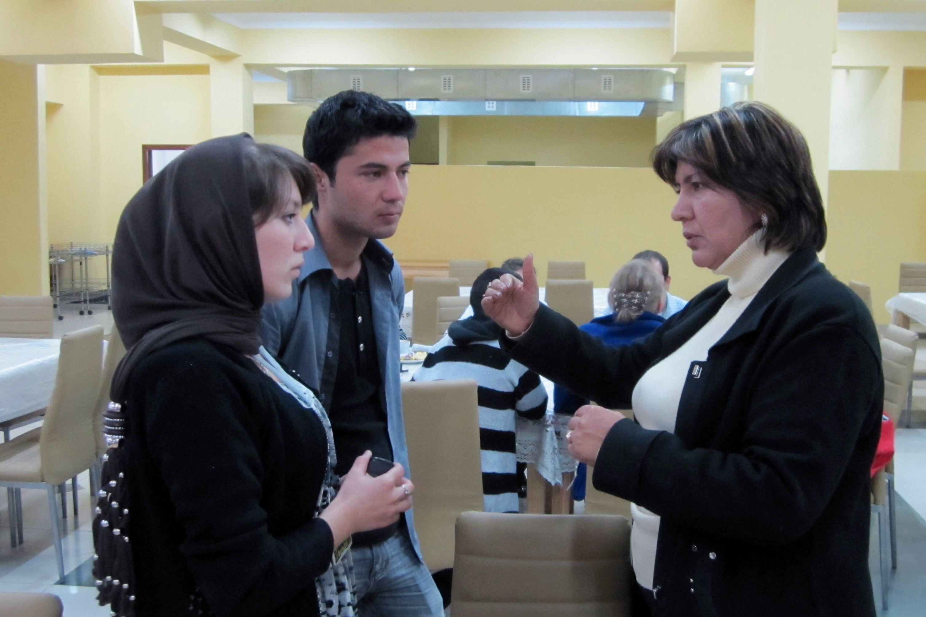 Dilbar Samadova (r), Chair of the Sughd branch of the Social Democratic Party, talks with students Marhaboi Khakim and Suhrob Nuridinov about the gap that needs to be bridged in women's participation in political life, Khujand, 28 October 2011.